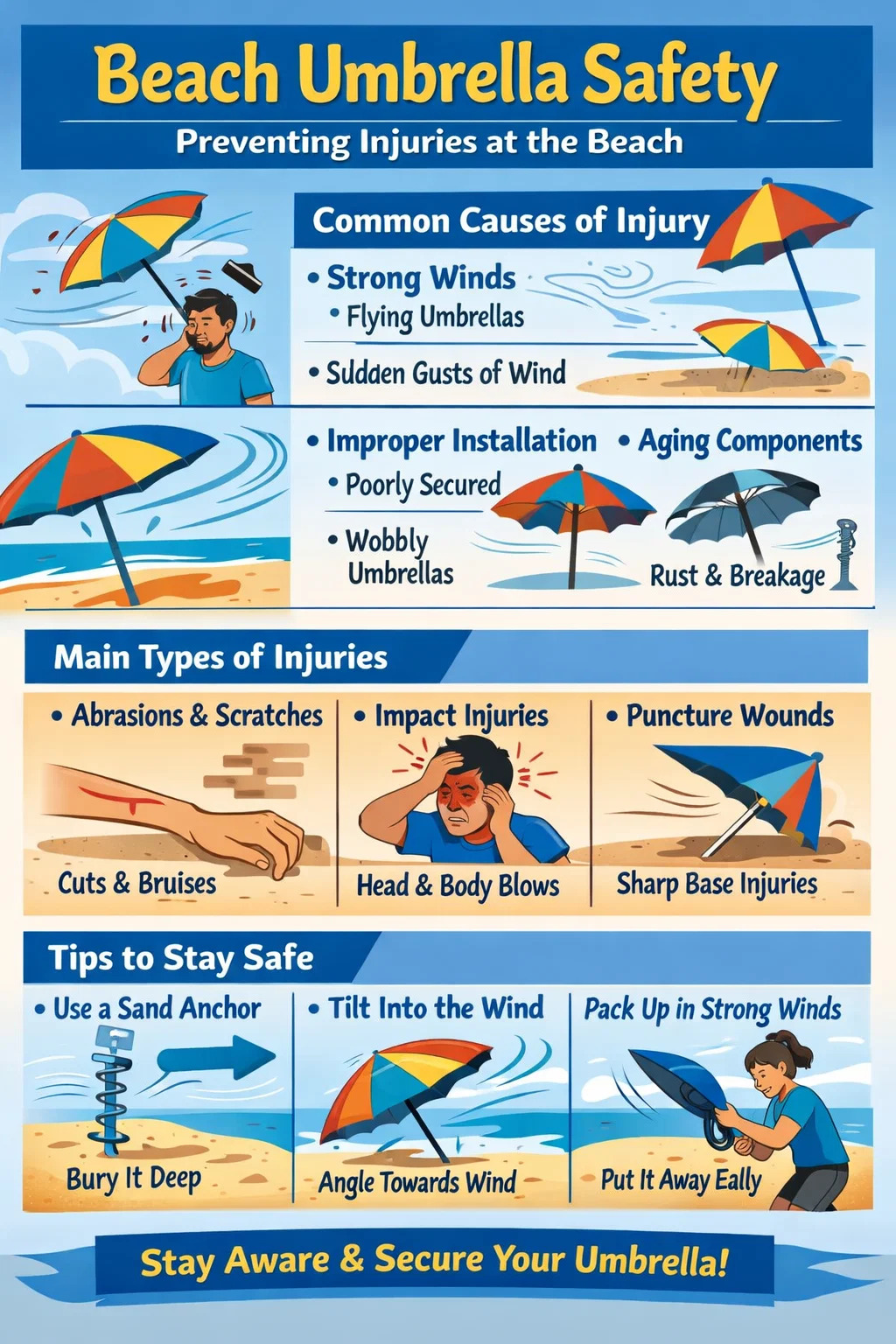 Selvom at gå til stranden er beregnet til afslapning, strandparasoller , hvis det ikke er ordentligt sikret, kan det faktisk blive en potentiel sikkerhedsrisiko. Hvert år kommer mange mennesker til skade, mens de nyder solskinnet.