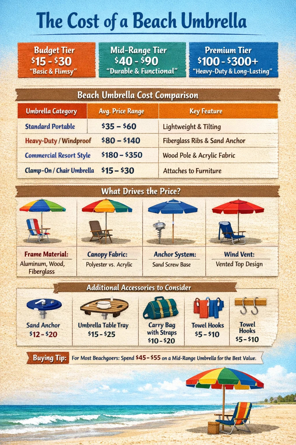 For den afslappede rejsende, der tager på stranden to gange om året, og bruger $45 til $55 på et mellemområde strandparasol er det "sweet spot". Det giver tilstrækkelig holdbarhed til at håndtere typiske kystbrise uden at bryde banken. Hvis du bor inden for køreafstand fra havet og planlægger ugentlige besøg, skal du investere $120 eller mere i en kraftig model med fiberglasribber vil du spare penge og frustration i det lange løb.