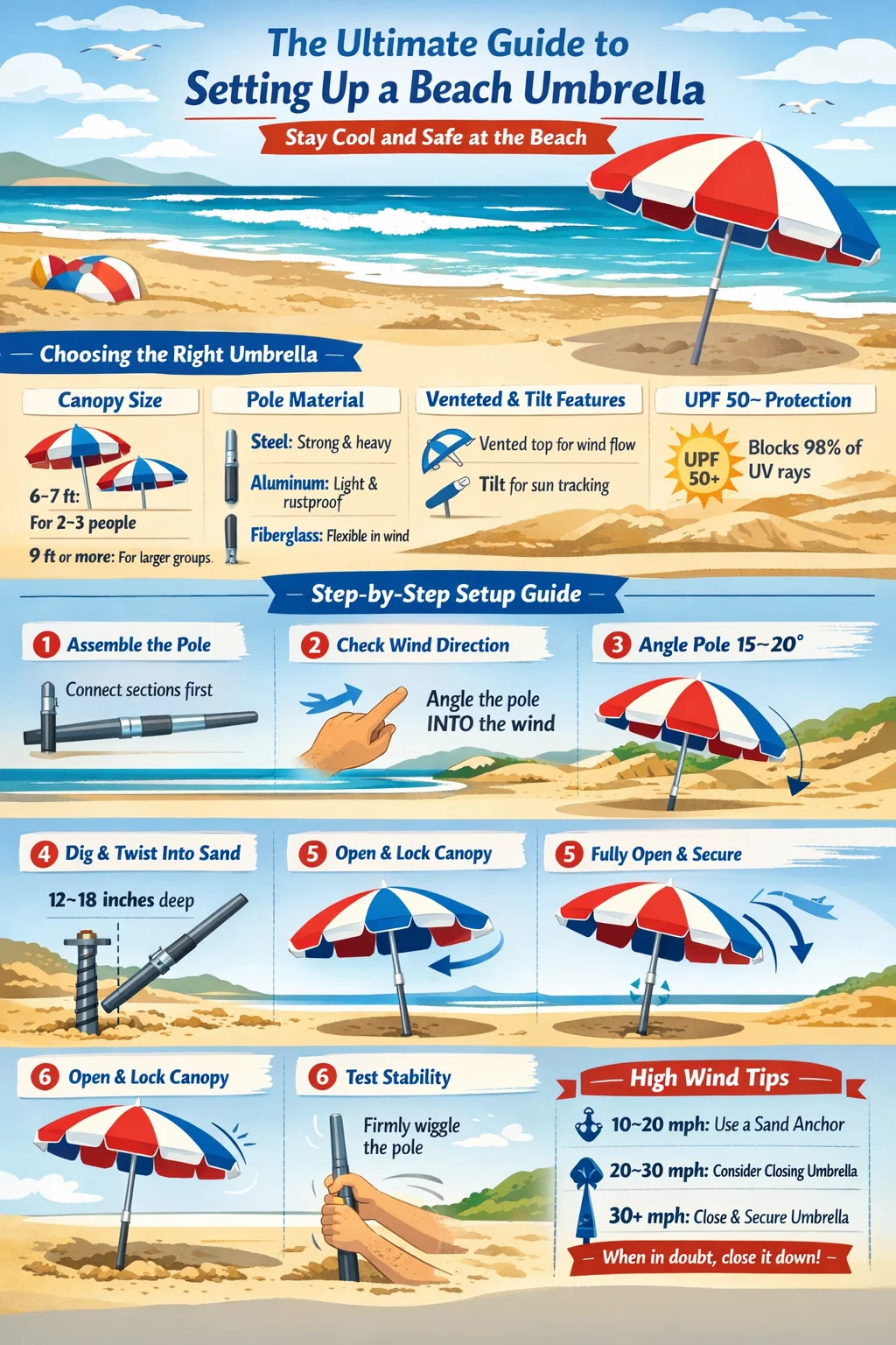 Denne guide dækker hvert trin i detaljer - fra at vælge den rigtige strandparaply til at holde den stabil i vindstød over 20 mph - så du kan bruge mindre tid på at bryde med udstyr og mere tid på at nyde vandet.