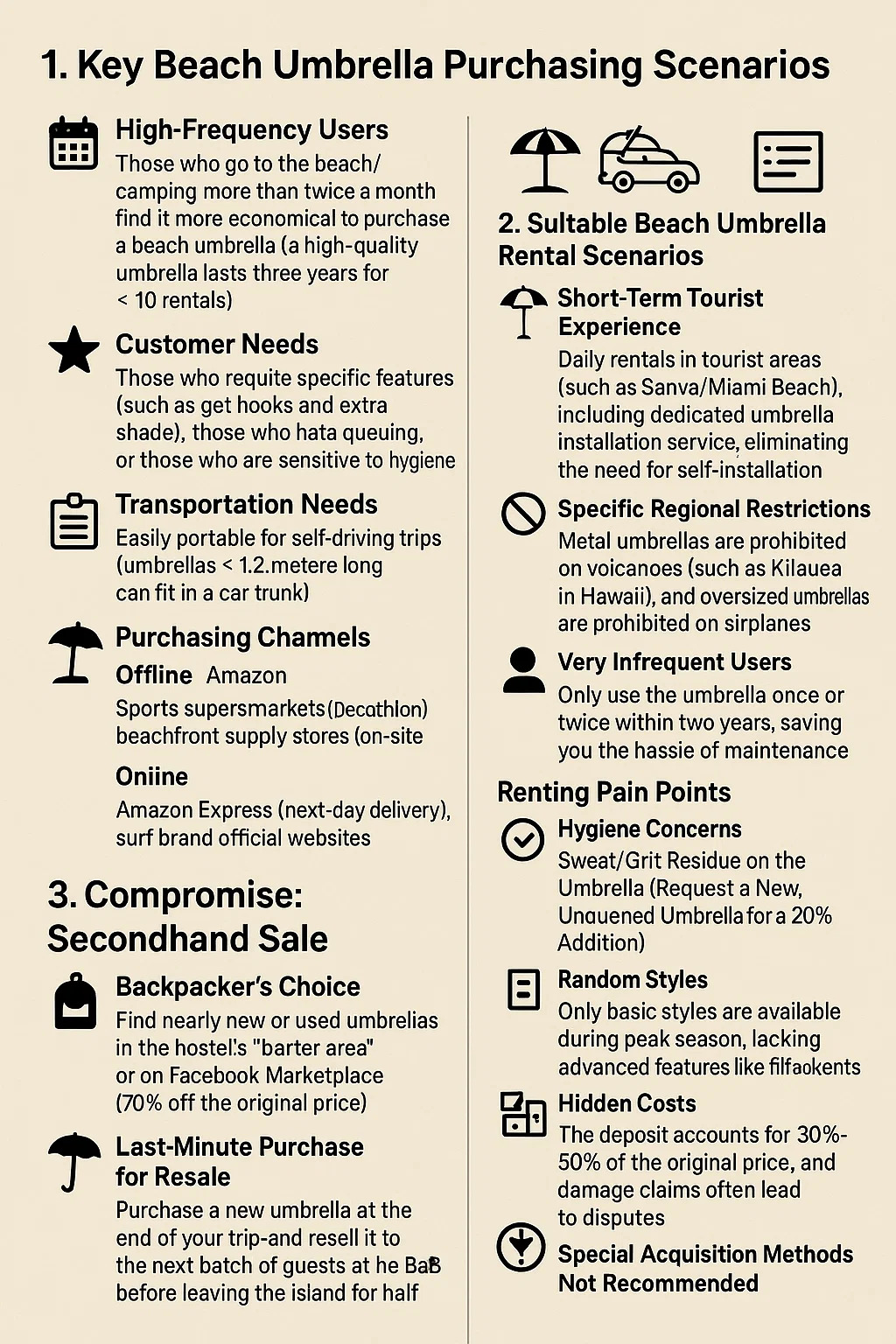 Erhvervelse af en Beach Paraply Kræver fleksibilitet baseret på hyppigheden af brug, rejse natur og budget. Følgende er en empirisk analyse: