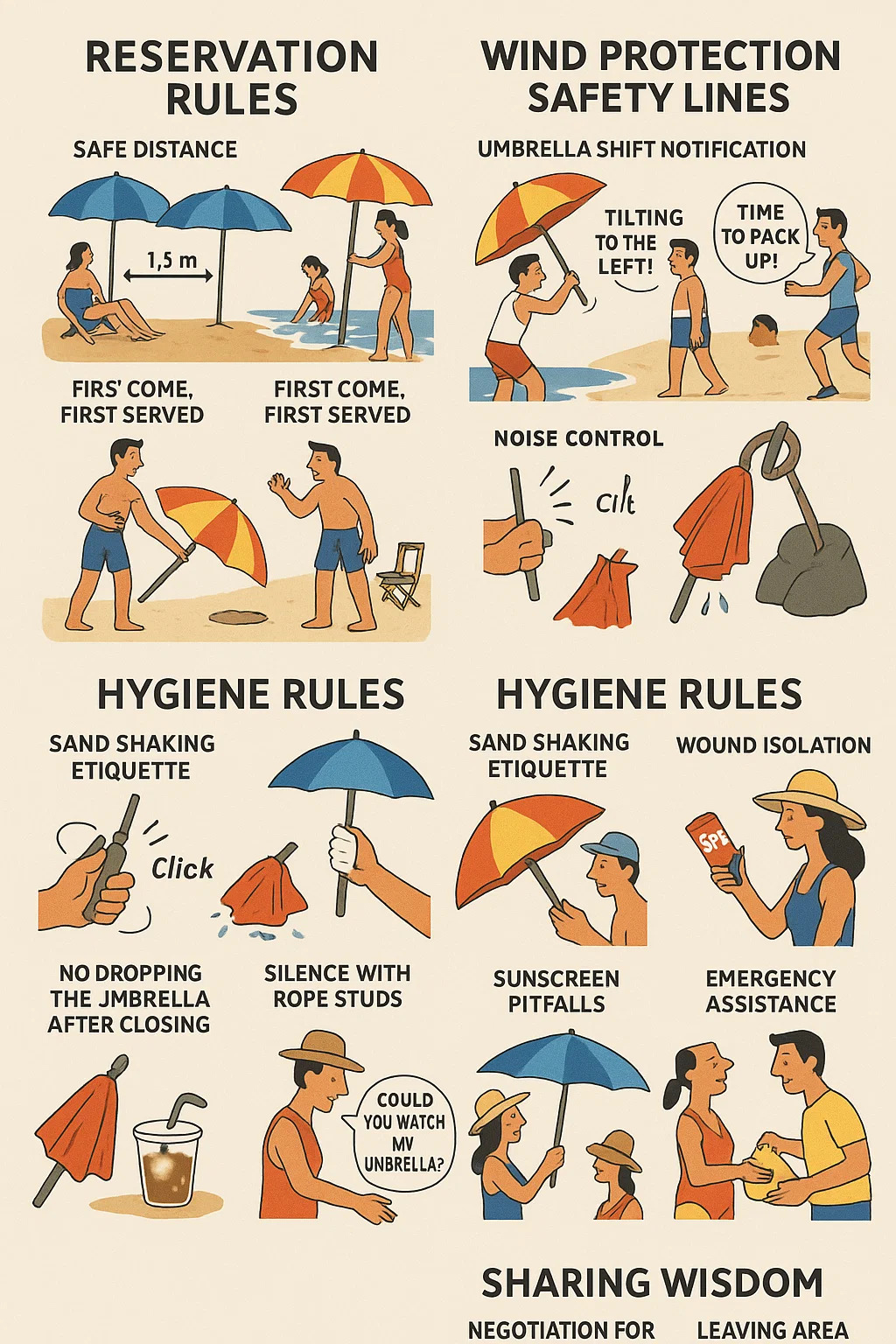 Sandrysteetikette: Inden du lukker din paraply, skal du ryste den tre gange på et afsidesliggende område for at undgå, at sand kommer ind i andres sandwich.