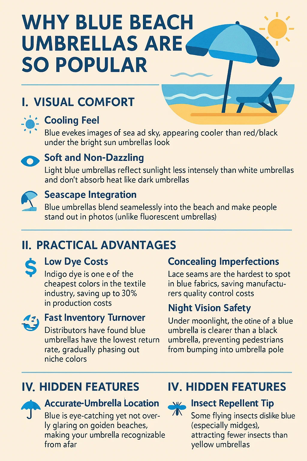 * **Seascape Integration:** Blå paraplyer blander sig problemfrit ind i stranden og får folk til at skille sig ud på billeder (i modsætning til fluorescerende paraplyer).